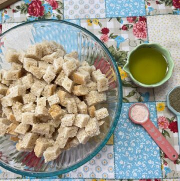 First, start by slicing up your bread into roughly, three quarter inch cubes, and place in a medium size bowl. Drizzle olive oil over the freshly sliced cubes and sprinkle salt and seasonings. Stir gently to combine