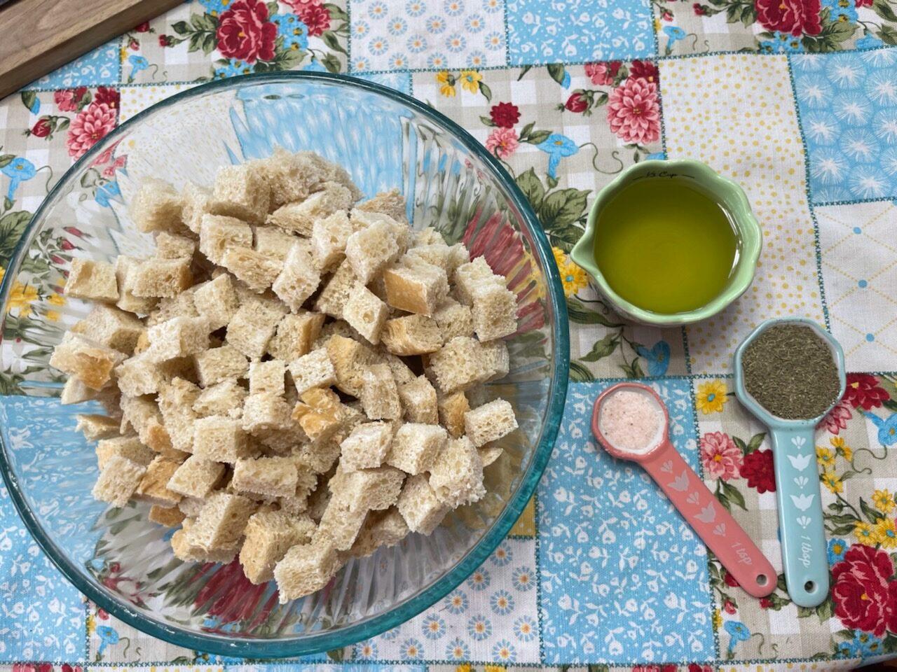 - Sprinkle salt and seasonings over bread cubes and gently mix together.