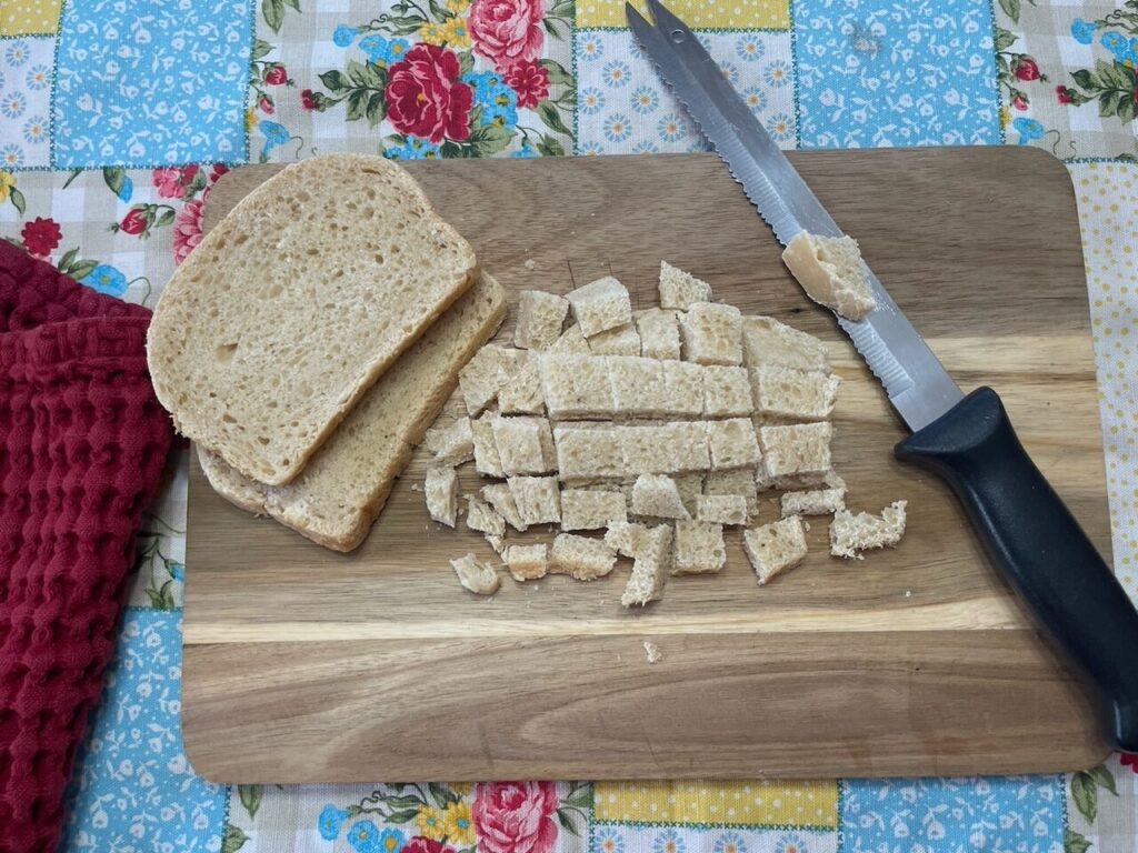 - Slice the entire loaf into 3/4 inch cubes.