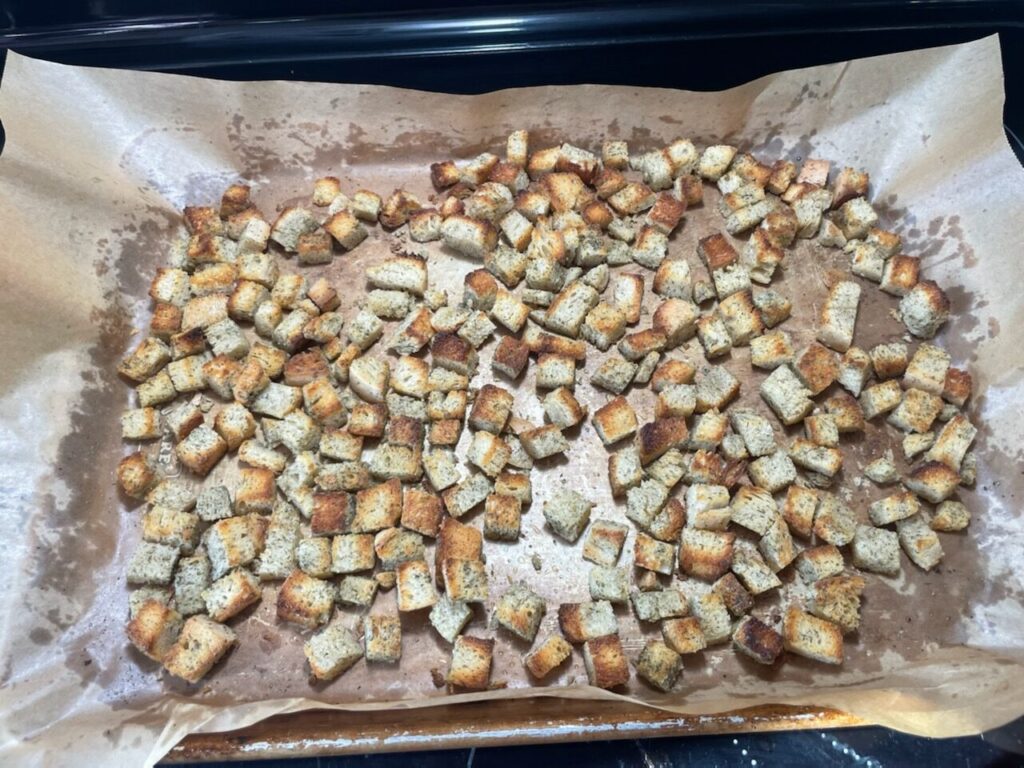 - Once nicely browned remove the croutons from the oven and let cool.